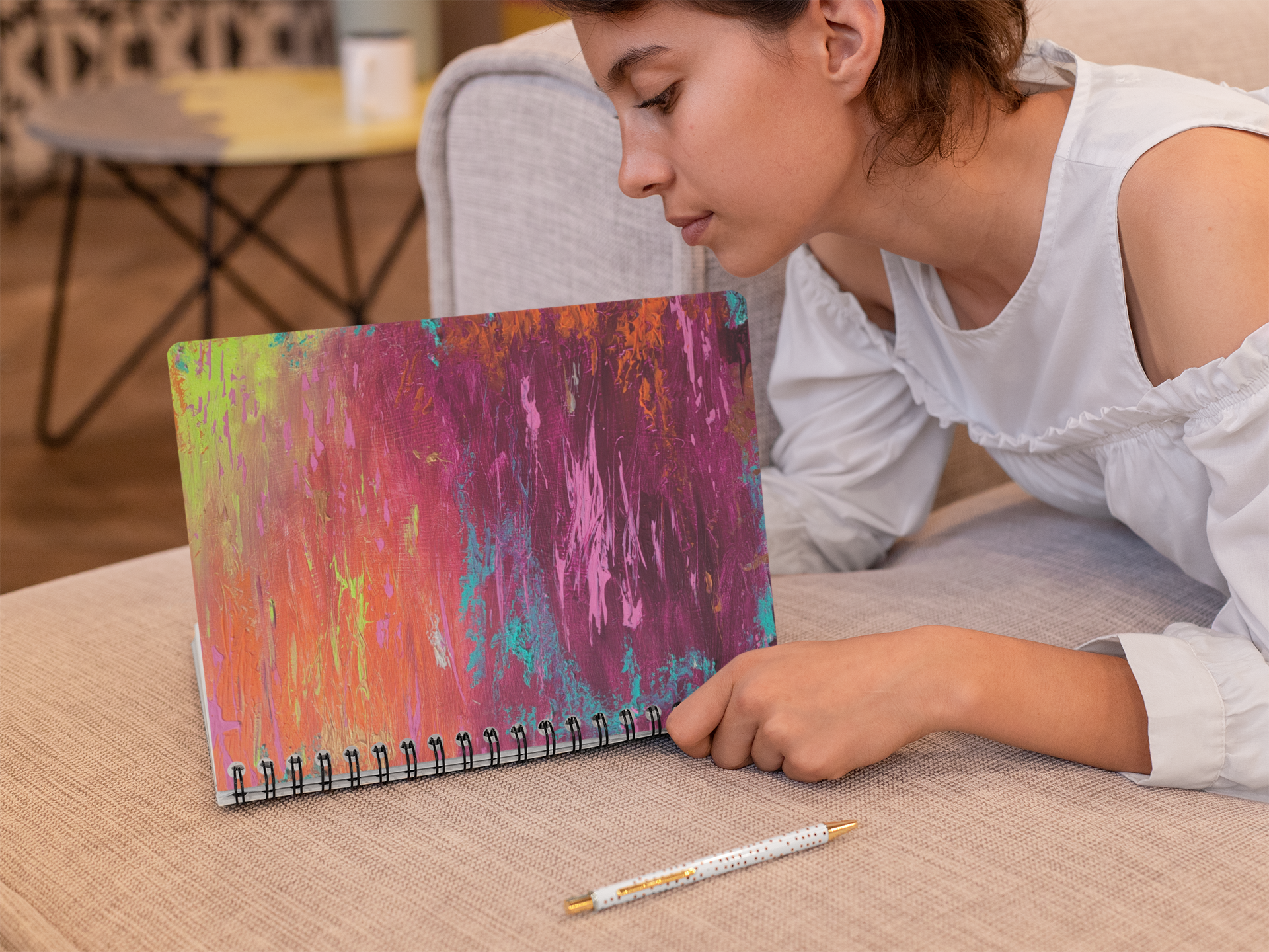 The "Sunset" notebook can help you with motivation to take more notes, write down ideas, or list future dreams. The front and back cover of the notebook features abstract artwork created with a harmonious blend of vibrant colors and delicate lines. This original wire-bound notebook will be a great daily companion whenever you need to put your thoughts down on paper!